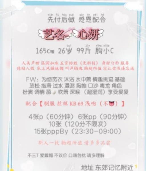 约了时间,到了地方老师指挥上楼,是个酒店式公寓,开门看到心妍老师瞬间激动,和照片基本没有差别。先洗了 ...