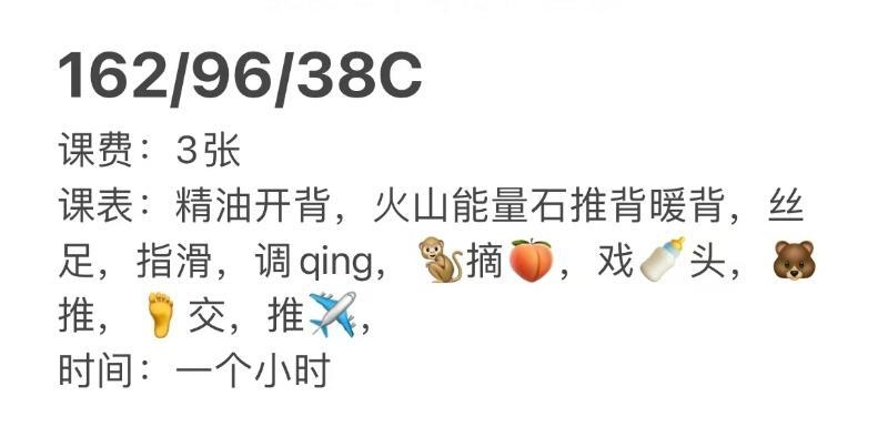 老师身材很不错,人美胸大屁股大,妥妥的炮架子一个,大胸和翘臀的手感都不错,课表上的服务都有,口活深喉 ...